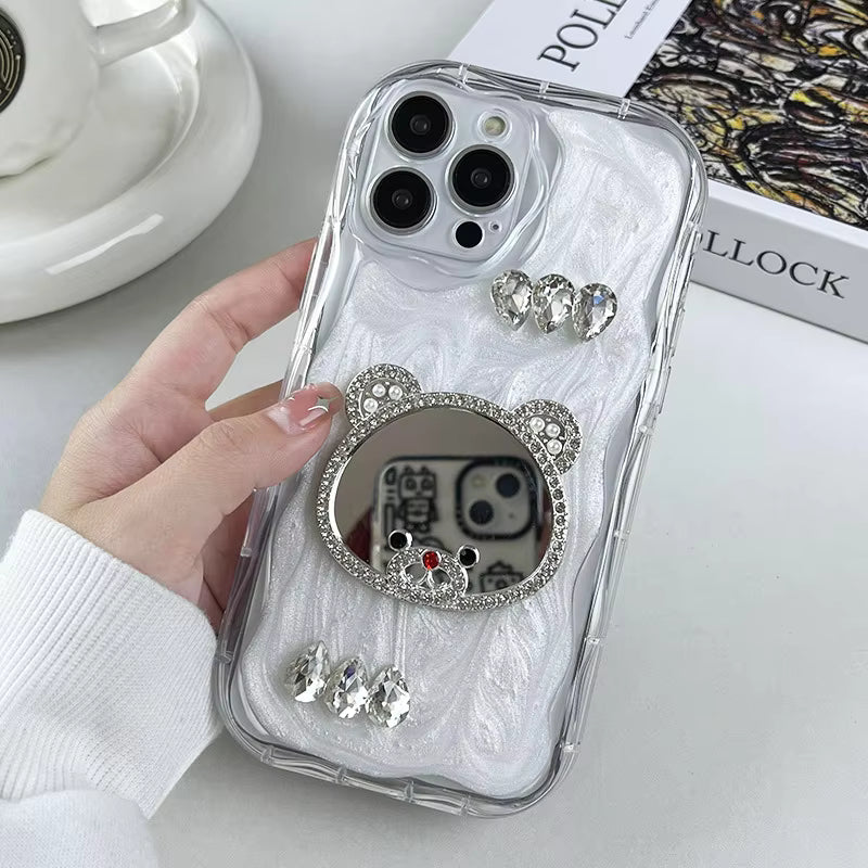 Luxury Style Bear Mirror Practical Function Wave Frame Diamond Glitter Soft TPU Phone Covers