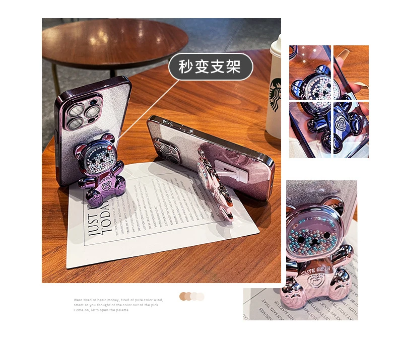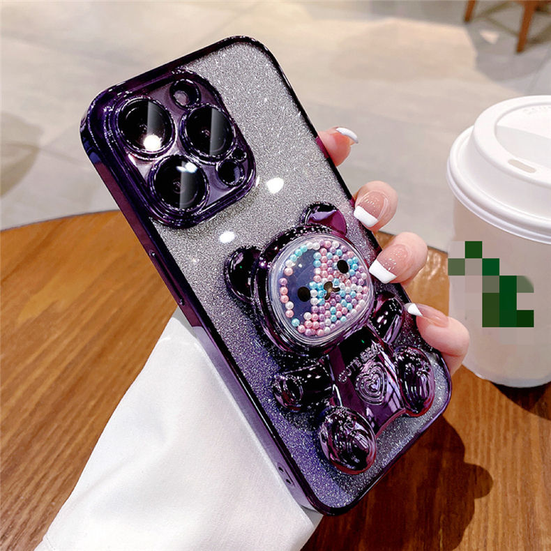 Electroplated Glitter Phone Case for iPhone 17 16 15 14 13 12 11 Pro Max Cute Bear Back Cover With Stand